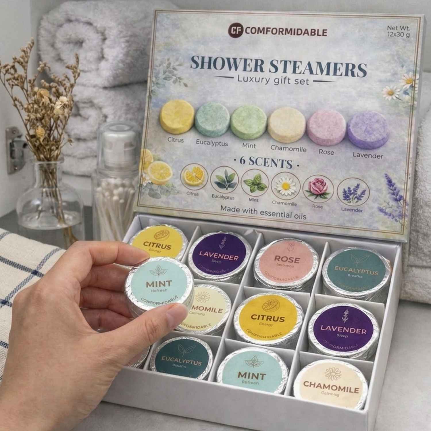 Comformidable® Aromatherapie-Duschdampfbäder – Luxuriöses Geschenkset (12 Stück / 6 Düfte)