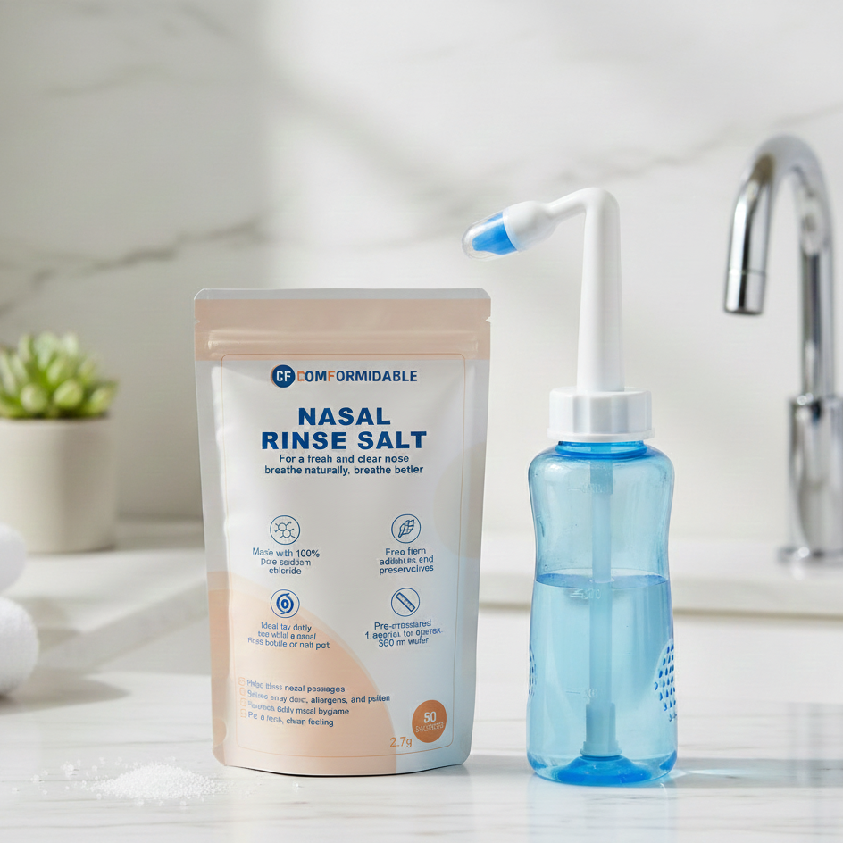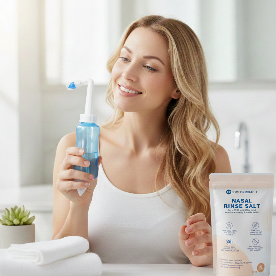 Mit dem nasalen Spülmittel von Comformidable reinigst du deine Nase einfach und gründlich. Dieses reine Spülmittel wurde speziell entwickelt, um mit einer Nasendusche verwendet zu werden und hilft, eine verstopfte Nase durch Erkältung, Heuschnupfen oder Allergien zu lindern. Perfekt für alle, die nach einer effektiven Möglichkeit suchen, die Nase zu reinigen und frei zu halten.